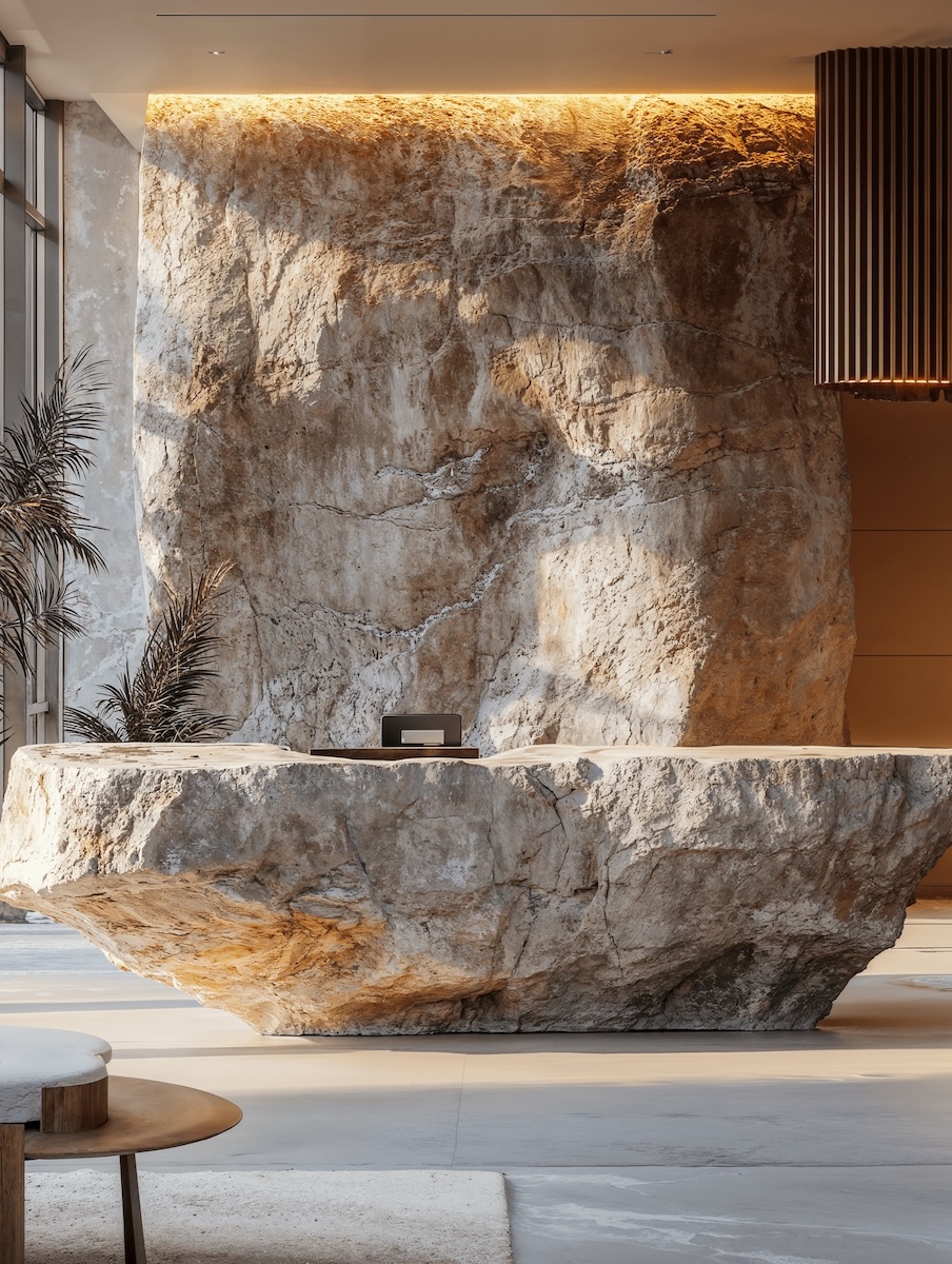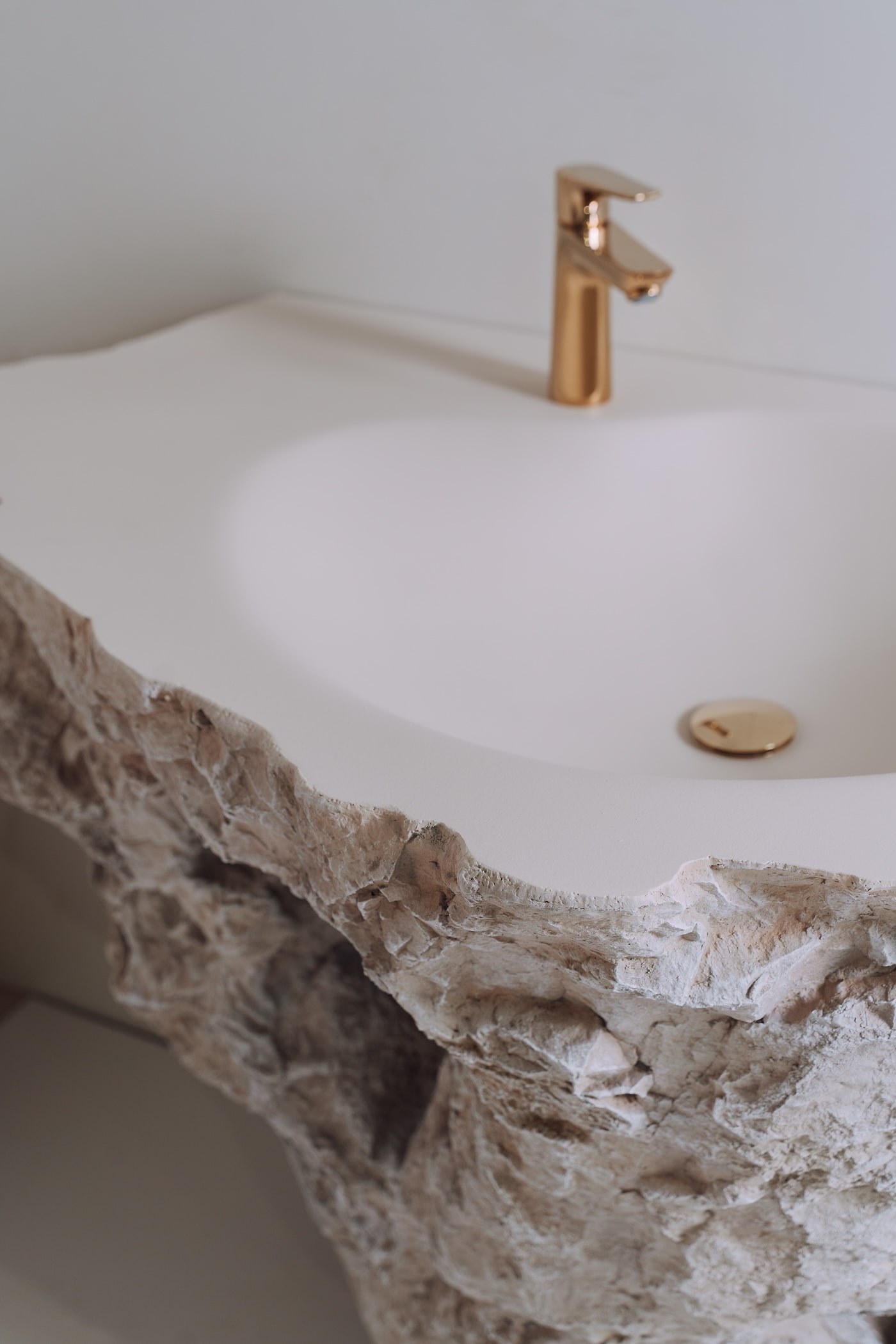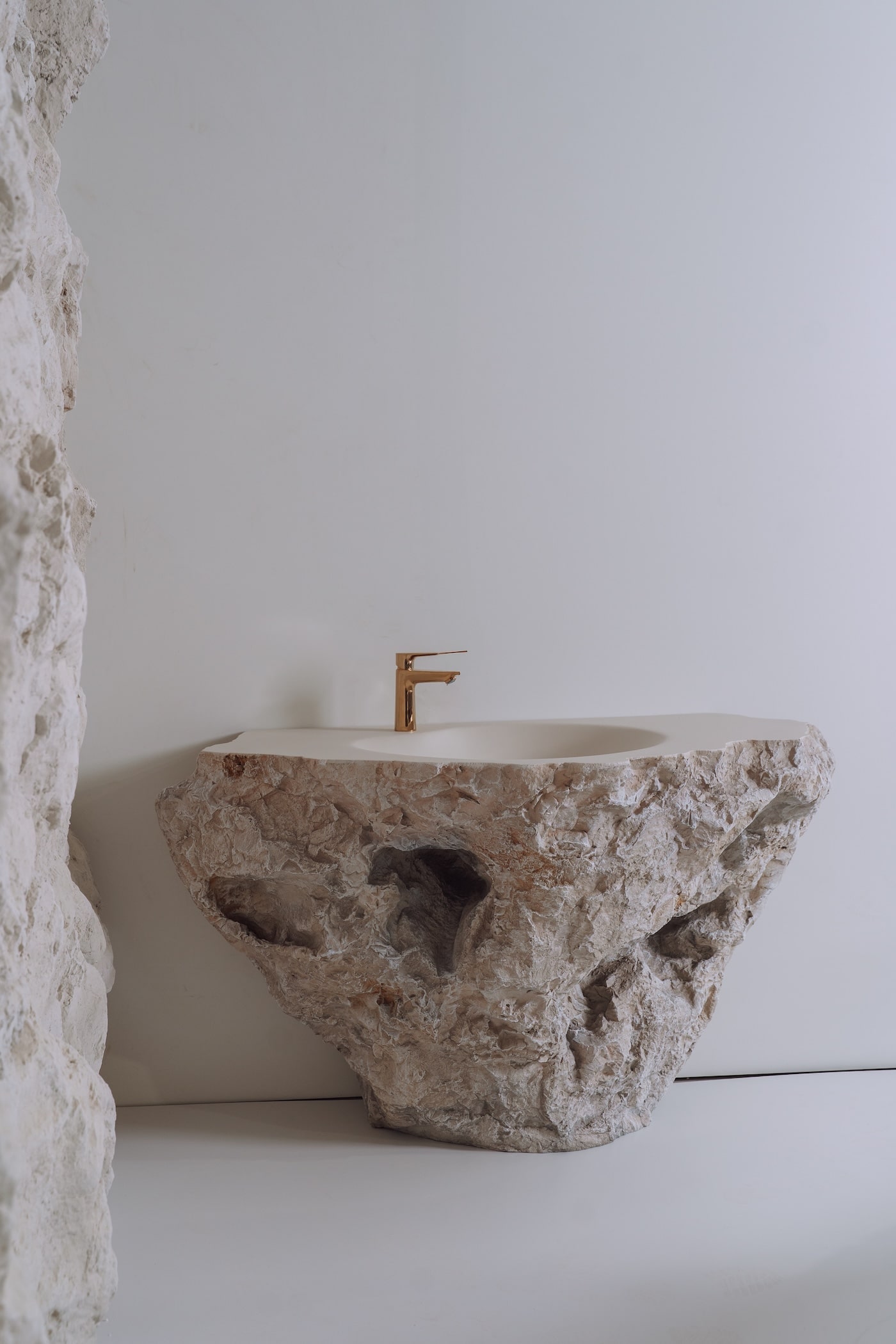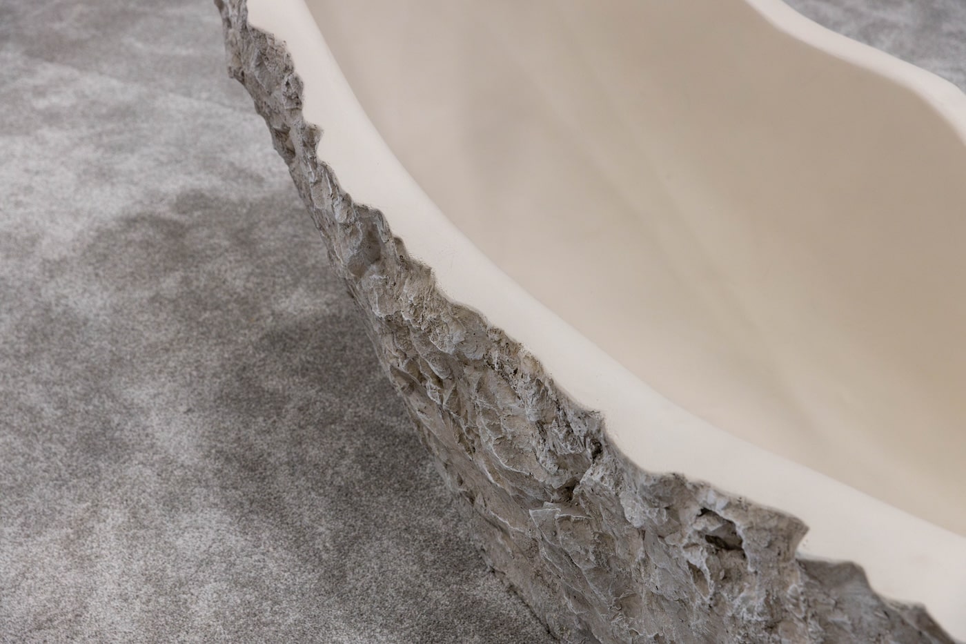 Resembling natural stone, it captivates with its design and beauty, while its textured exterior forms a striking contrast with the smooth, polished interior, offering a unique sense of luxury and perfect comfort.